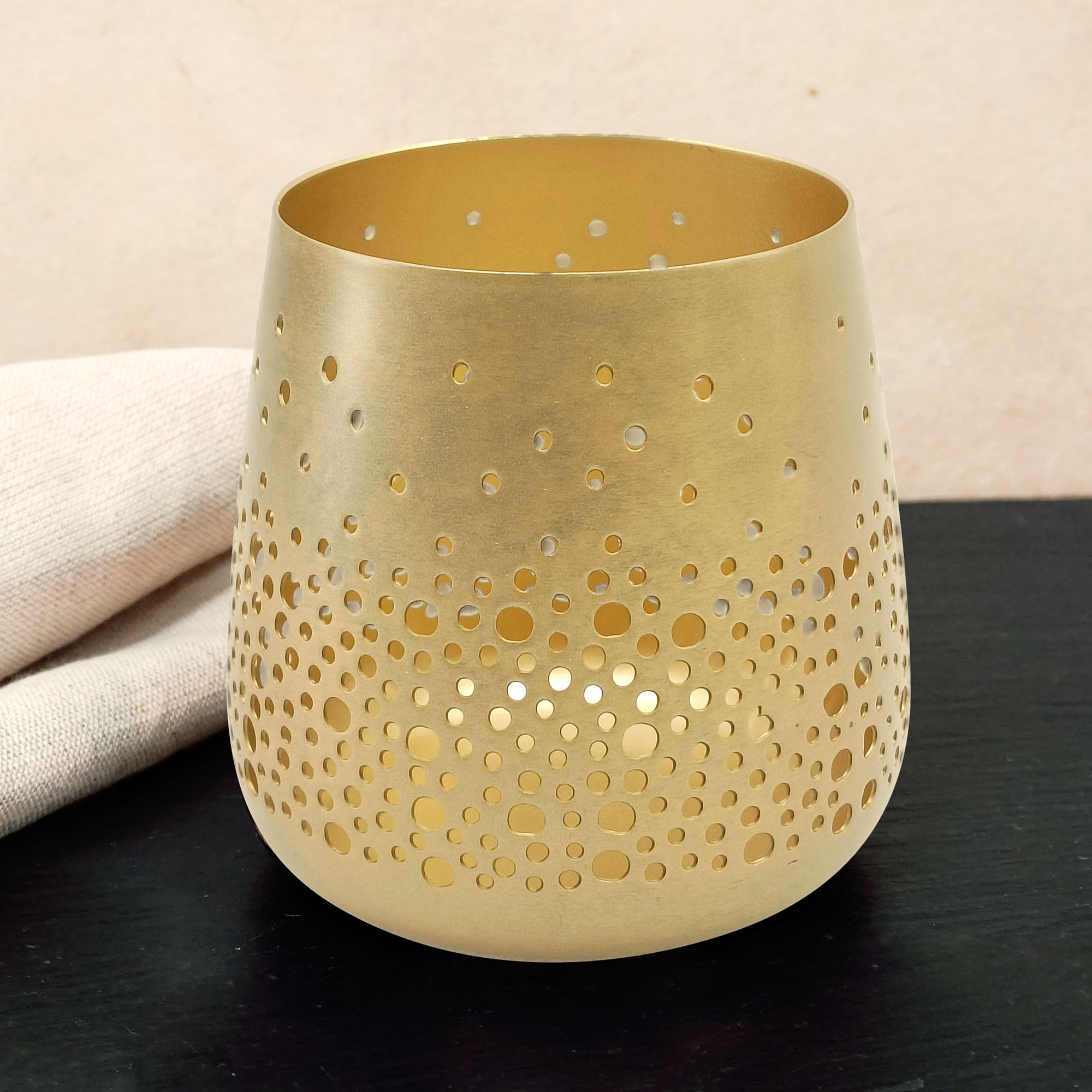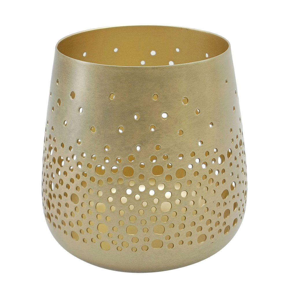 Aus Metall in der Farbe gold antik, innen goldfarben. Das becherförmige Design besticht mit einem ganz besonderen Muster! Dieses erzeugt dekorative Reflexionen des Kerzenlichtes. Abmessungen*: H ca. 9 cm, Ø ca. 12 cm