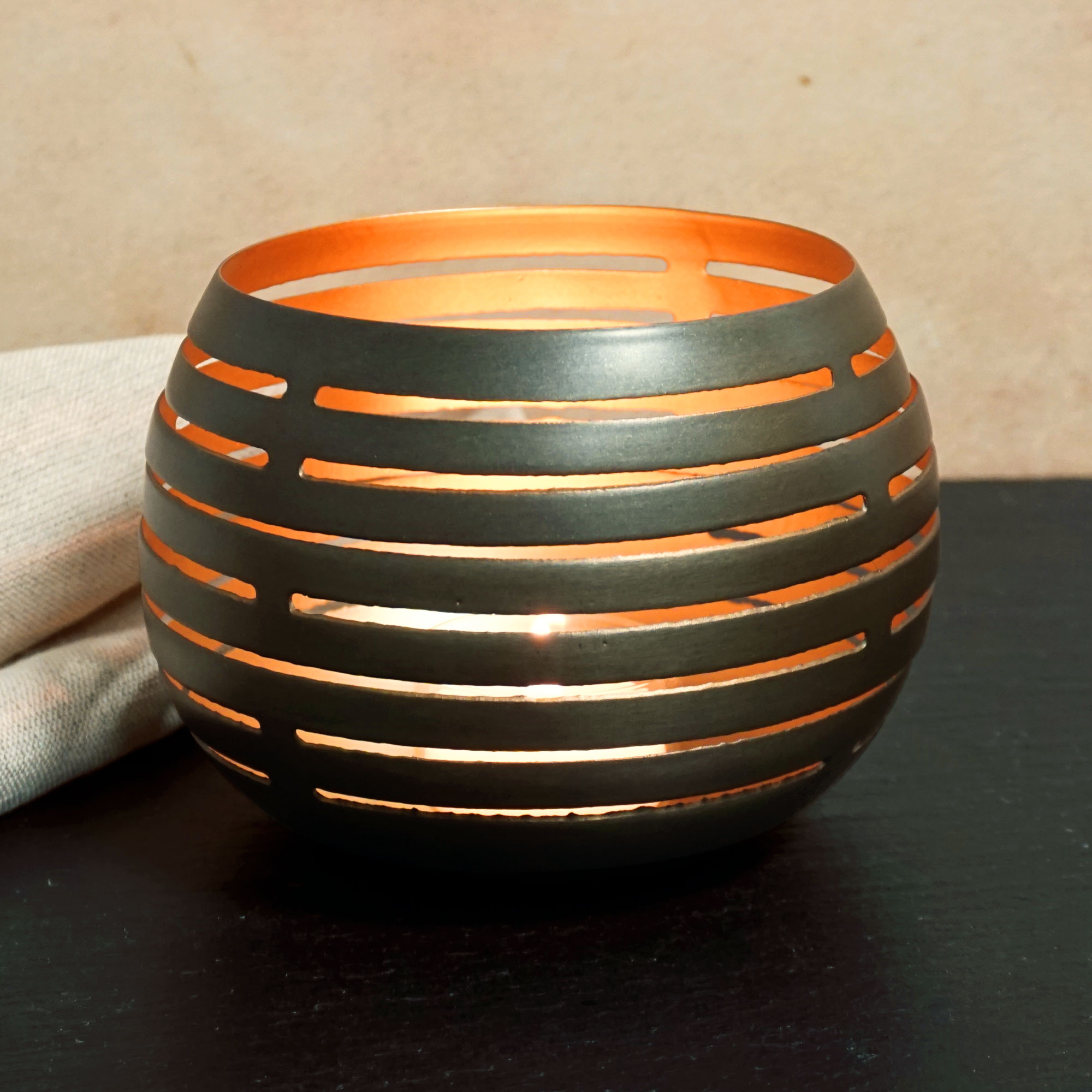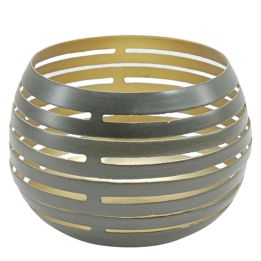 Aus Metall in der Farbe zink antik, innen goldfarben. Die große, runde Form besitzt ein modernes Muster! Dieses erzeugt dekorative Reflexionen des Kerzenlichtes. Abmessungen: H ca. 9 cm, Ø ca. 12 cm