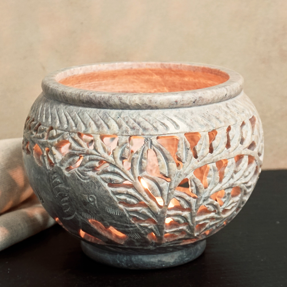 Dieses dekorative Windlicht ist in liebevoller Handarbeit aus indischem Softstone gefertigt.