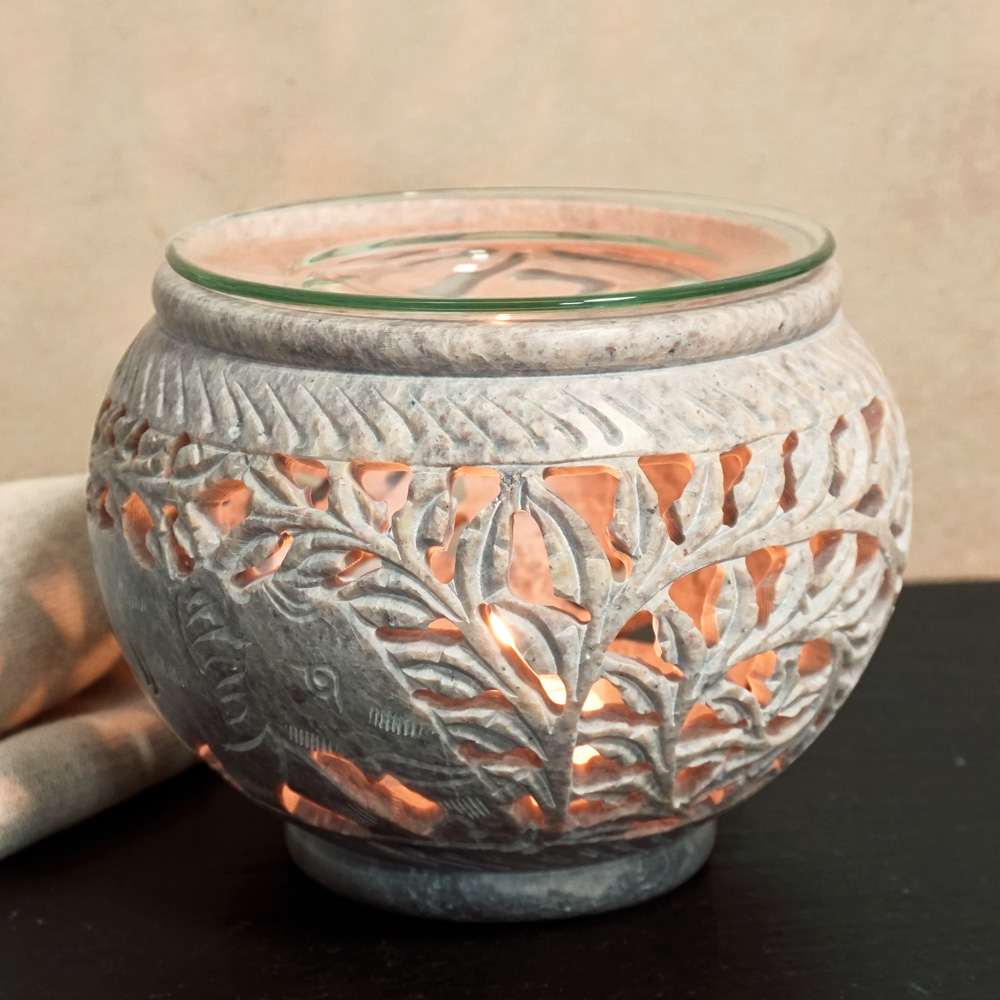 Diese dekorative Duftlampe ist in liebevoller Handarbeit aus indischem Softstone gefertigt.