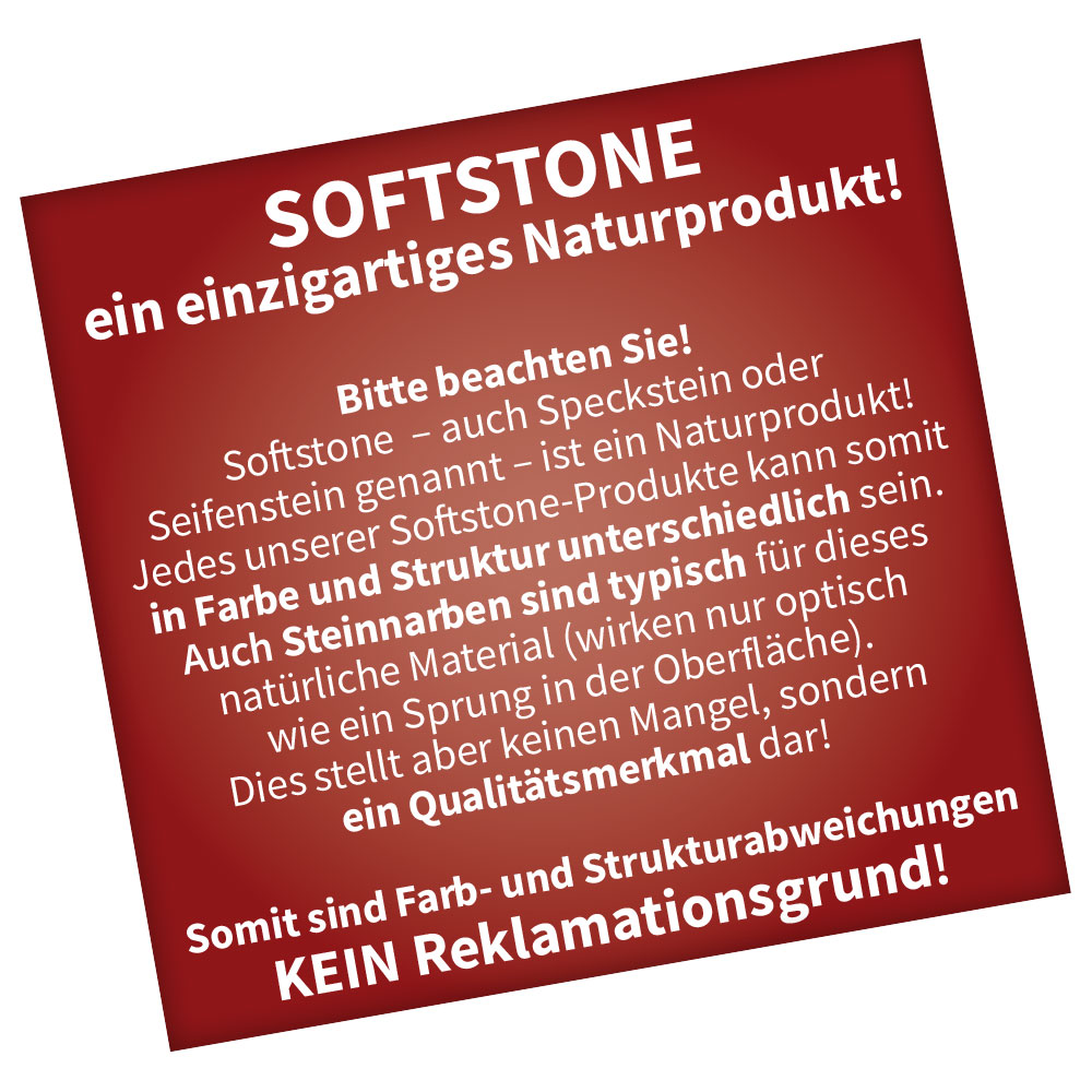Wichtiger Hinweis zum Material: Softstone ist ein einzigartiges Naturprodukt – auch bekannt als Speckstein oder Seifenstein. Farbe und Struktur können von Stück zu Stück variieren, und typische Steinnarben können auftreten. Diese wirken zwar wie kleine Risse, sind jedoch völlig normal und stellen keinen Mangel dar, sondern ein charakteristisches Qualitätsmerkmal dieses natürlichen Materials. Farb- und Strukturabweichungen sind daher kein Reklamationsgrund.
