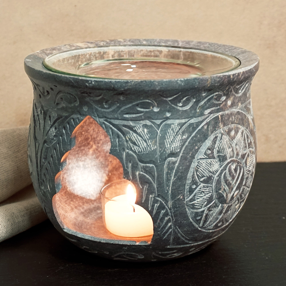 Diese dekorative Duftlampe ist in liebevoller Handarbeit aus indischem Softstone gefertigt.