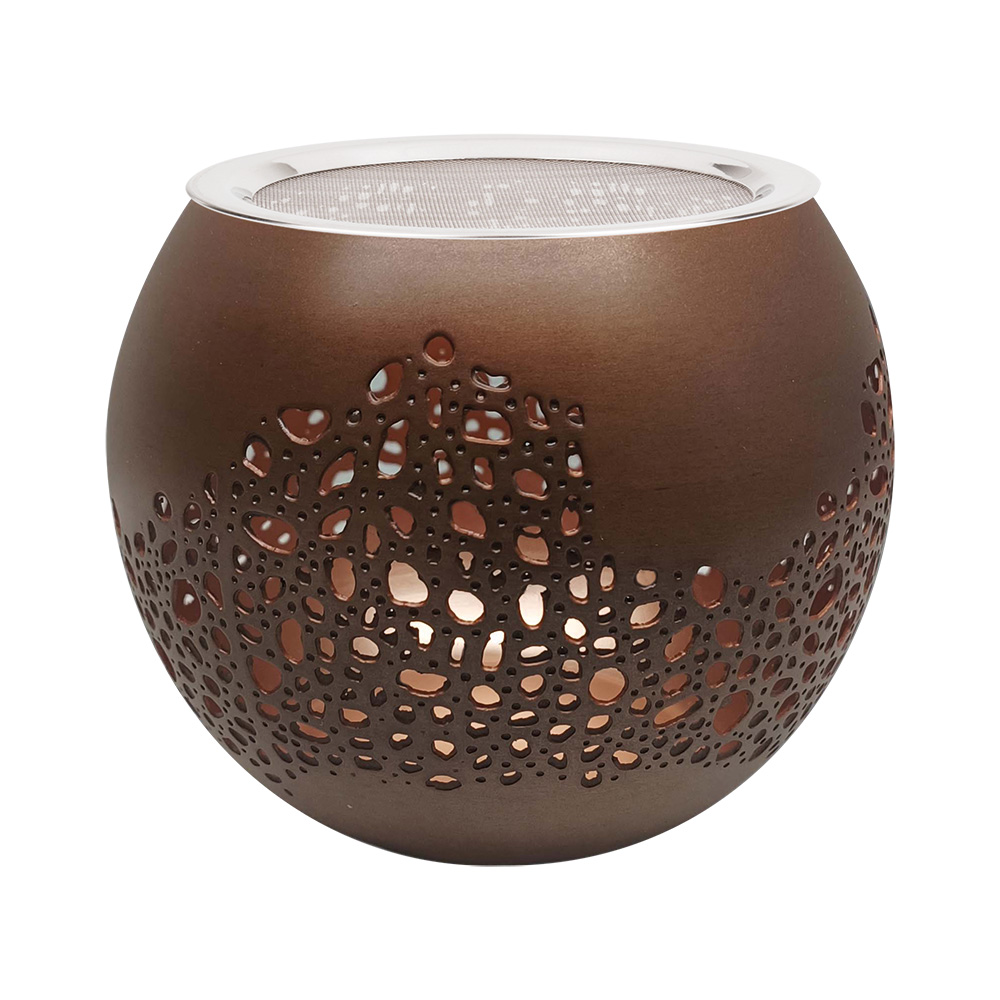 Sorgfältig von Hand gearbeitet. Die große, runde Form besitzt ein ganz besonderes Lochmuster! Das scheinbar zufällig angeordnete Muster lässt das durchscheinende Licht der Kerze als stimmungsvolle Reflektionen im Raum erscheinen.